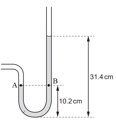 Một đầu của ống hình chữ U được gắn vào một vòi khí, đầu kia của nó để hở ra khí quyển. Ống chứa nước có khối lượng riêng \(1000\,\,kg/{m^3}\) và chiều cao của nước ở hai nhánh được biểu diễn trên hình vẽ. Áp suất khí quyển là 101 kPa. Áp suất của khí ra khỏi vòi khí là bao nhiêu?