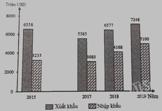 Cho biểu đồ:GIÁ TRỊ XUẤT NHẬP KHẨU CỦA BRU-NÂY GIAI ĐOẠN 2015-2019(Số liệu theo Niên giám