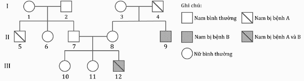 Ở người, bệnh A do 1 gen có 2 alen trên NST thường quy định, alen trội quy không bị bệnh trội hoàn toàn so với alen lặn quy định bị bệnh; bệnh B do 1 cặp gen khác nằm trên vùng không tương đồng của NST giới tính X quy định, alen trội quy định không bị bệnh trội hoàn toàn so với alen lặn quy định bị bệnh. Cho sơ đồ phả hệ sau: