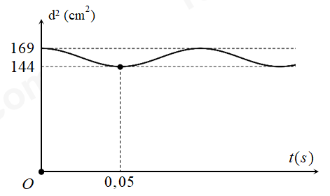 Một sợi dây đàn hồi căng ngang, đang có sóng dừng ổn định. Trên dây, N là một điểm nút, M là điểm bụng gần N nhất. Gọi d là khoảng cách giữa M và N ở thời điểm t. Biết rằng giá trị của \({d^2}\) phụ thuộc vào thời gian được mô tả bởi đồ thị như hình bên. Điểm P trên dây có vị trí cân bằng là trung điểm của MN khi dây duỗi thẳng. Gia tốc dao động cực đại của P gần nhất với giá trị nào sau đây?