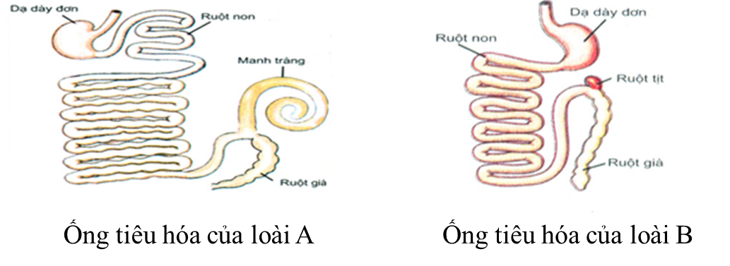 Hình vẽ dưới đây mô tả ống tiêu hóa của 2 loài động vật
