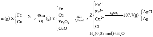 Đốt hỗn hợp m gam X gồm Fe và Cu trong O2, thu được 49m/39 gam hỗn hợp Y gồm Fe, Cu, Fe3O4 và CuO. Cho Y tan hết vào dung dịch chứa 0,6 mol HCl, thu được dung dịch Z chỉ chứa muối và 0,05 mol H2. Cho Z tác dụng với dung dịch AgNO3 dư thu được 107,7 gam kết tủa. Biết các phản ứng xảy ra hoàn toàn. Khối lượng của Cu trong X là