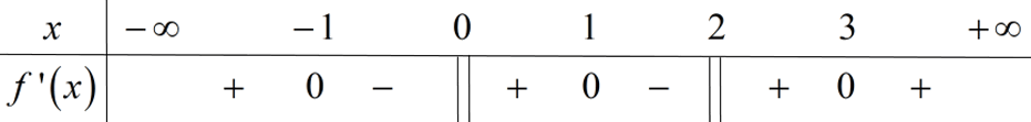 Cho hàm số \(y = f\left( x \right)\) liên tục trên \(\mathbb{R}\) và có đạo hàm tại mọi điểm \(x \in \mathbb{R}{\rm{\backslash }}\left\{ {0;2} \right\}\). Biết bảng xét dấu của hàm số \(y = f'\left( x \right)\) như sau: