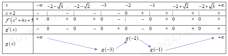 Lập BBT của \(y = f\left( {{x^2} + 4x + 5} \right)\). Từ đó kết luận số cực trị của hàm số \(y = \left| {f\left( {{x^2} + 4x + 5} \right)} \right|\).