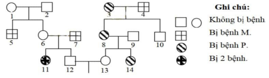 Phả hệ ở dưới đây mô tả sự di truyền 2 bệnh ở người: Bệnh P do một trong hai alen của một gen nằm trên nhiễm sắc thể thường quy định; bệnh M do một trong hai alen của một gen nằm ở vùng không tương đồng trên nhiễm sắc thể giới tính X quy định. Biết rằng không xảy ra đột biến. Theo lí thuyết, xác suất sinh con thứ nhất chỉ bị bệnh M của cặp vợ chồng 12-13 là