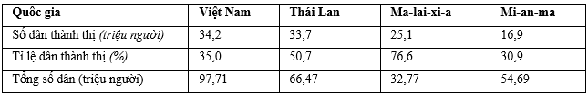 Cho bảng số liệu:SỐ DÂN THÀNH THỊ VÀ TỈ LỆ DÂN THÀNH THỊ CỦA MỘT SỐ QUỐC GIA NĂM 2020