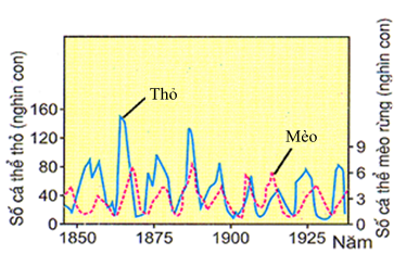 Hình bên mô tả sự biến động số lượng cá thể của quần thể thỏ (con mồi) và số lượng