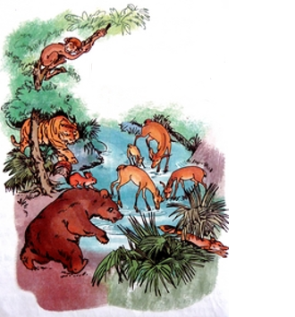 Nói tên và hoạt động của những con vật trong tranh và đặt câu với các từ đó. Mẫu: cáo –