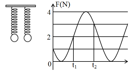 Hai con lắc lò xo giống hệt nhau, được treo vào cùng một giá cố định tại nơi có \(g = 10m/{s^2}\). Điểm treo của hai con lắc cách nhau 8 cm. Kích thích cho hai con lắc dao động điều hòa theo phương thẳng đứng. Hợp lực tác dụng lên giá treo có giá trị phụ thuộc vào thời gian như hình vẽ bên. Tốc độ của con lắc thứ nhất và gia tốc của con lắc thứ hai đồng thời triệt tiêu. Biết \({t_2} - {t_1} = \dfrac{\pi }{{24}}\,\,s\). Khoảng cách cực đại giữa hai quả cầu gần nhất với giá trị nào sau đây?