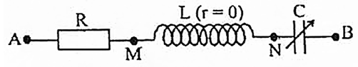 Đặt điện áp xoay chiều (có giá trị hiệu dụng và tần số không đổi) vào hai đầu đoạn mạch như hình vẽ bên. Cuộn cảm có độ tự cảm \(L = \dfrac{{0,1}}{\pi }H\); điện trở có giá trị \(R = 20\Omega \). Điện dung của tụ điện thay đổi được. Khi điện dung của tụ điện có giá trị \({C_1}\) thì điện áp hiệu dụng giữa hai điểm N, B đạt cực đại. Khi điện dung có giá trị \({C_2}\) thì điện áp hiệu dụng giữa hai điểm M, N đạt cực đại. Hiệu số \(\Delta {C^{ - 1}} = {C_1}^{ - 1} - {C_2}^{ - 1}\) có giá trị là
