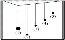 Khi làm thực hành về hiện tượng cộng hưởng cơ ta có hệ thống các con lắc đơn bố trí như hình vẽ. Con lắc 1 là con lắc điều khiển. Kéo con lắc điều khiển 1 lệch khỏi vị trí cân bằng rồi thả nhẹ cho dao động. Các con lắc còn lại thực hiện đao động cưỡng bức, con lắc dao động mạnh nhất là