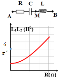 Đặt điện áp xoay chiều có tần số và giá trị hiệu dụng không đổi vào hai đầu đoạn mạch AB gồm đoạn AM và MB nối tiếp. Trong đó đoạn AM gồm biến trở R nối tiếp với tụ điện C, đoạn MB chỉ chứa cuộn cảm thuần có độ tự cảm L thay đổi được. Khi \(L = {L_1}\) thì điện áp hiệu dụng ở hai đầu đoạn mạch AM không phụ thuộc vào giá trị của biến trở R. Ứng với mỗi giá trị của R , khi \(L = {L_2}\) thì điện áp hiệu dụng của cuộn cảm đạt giá trị cực đại. Hình vẽ bên là đồ thị biểu diễn sự phụ thuộc của tích \({L_1}{L_2}\) theo R. Để công suất tiêu thụ của mạch điện ứng với mỗi R đạt cực đại thì giá trị của L là