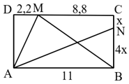 Ở mặt nước có hai nguồn kết hợp đặt tại hai điểm A và B \(\left( {AB = 11cm} \right)\), dao động cùng tần số, cùng biên độ, cùng pha theo phương thẳng đứng, phát ra hai sóng có bước sóng \(\lambda = 2cm\). Ở mặt nước có đường thẳng \(\left( \Delta \right)\) song song với AB, trên \(\left( \Delta \right)\) lấy hai điểm C và D sao cho ABCD là hình chữ nhật. Hai điểm M, N theo thứ tự thuộc đoạn CD và CB, sao cho \(MC:MD = NB:NC = 4:1\). Di chuyển \(\left( \Delta \right)\) theo phương vuông góc với cạnh AB đến vị trí sao cho góc \(\angle MAN\) đạt giá trị lớn nhất, khi đó số điểm cực đại giao thoa có trên đoạn MN bằng