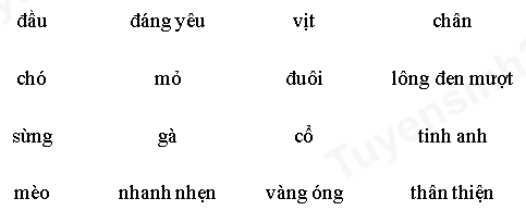 Xếp các từ đã cho vào các nhóm thích hợp. - Từ chỉ con vật - Từ chỉ bộ phận của con