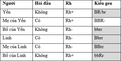 Ở người, gen quy định tính trạng hói đầu bị ảnh hưởng bởi giới tính. Phụ nữ có kiểu gen BB bị hói, tuy nhiên phụ nữ Bb và bb thì không. Đàn ông có kiểu gen BB và Bb bị hói, đàn ông bb thì không. Yếu tố Rh do gen R quy định, kiểu gen của người Rh- là rr và của người Rh+ là RR hoặc Rr. Khi một người phụ nữ Rh- mang thai nhi có Rh+, hệ miễn dịch của người phụ nữ có thể tạo ra các kháng thể kháng lại Rh+ của thai nhi trong lần mang thai thứ hai, có thể dẫn đến cái chết của thai nhi. Hiện tượng này được gọi là sự không tương thích Rh. Hai gen này cùng nằm trên một cặp nhiễm sắc thể thường và cách nhau 20cM. Hai vợ chồng Yến và Linh đến một văn phòng tư vấn di truyền và được bác sĩ thu thập dữ liệu như tóm tắt trong bảng dưới đây