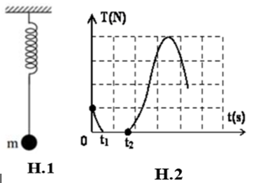 Lò xo nhẹ một đầu cố định, đầu còn lại gắn vào sợi dây mềm, không giãn có treo vật nhỏ m như hình vẽ (H.1). Khối lượng dây và sức cản của không khí không đáng kể. Tại \({\rm{t}} = 0,\) m đang đứng yên ở vị trí cân bằng thì được truyền vận tốc \({v_0}\) thẳng đứng từ dưới lên. Sau đó lực căng dây T tác dụng vào m phụ thuộc thời gian theo quy luật được mô tả bởi đồ thị hình vẽ (H.2). Biết lúc vật cân bằng lò xo giãn 10 cm và trong quá trình chuyển động m không va chạm với lò xo. Quãng đường m đi được kể từ lúc bắt đầu chuyển động đến thời điểm \({t_2}\) là