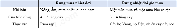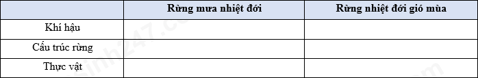 Hãy hoàn thành bảng theo mẫu sau để so sánh đặc điểm của rừng mưa nhiệt đới và rừng nhiệt đới gió mùa: