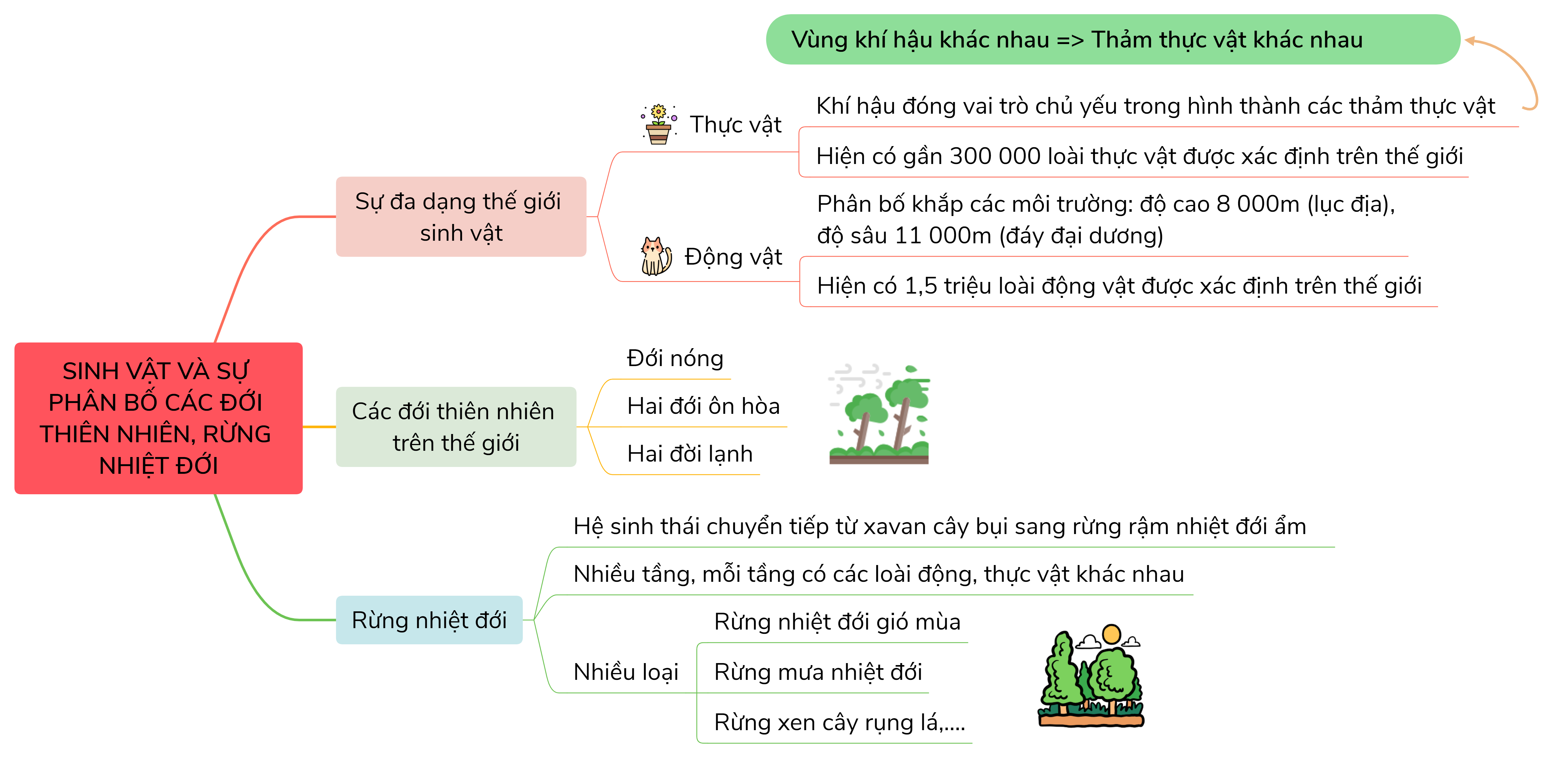Hãy vẽ sơ đồ tư duy thể hiện nội dung bài học: "Sinh vật và sự phân bố thiên nhiên trên Trái đất. Rừng nhiệt đới".