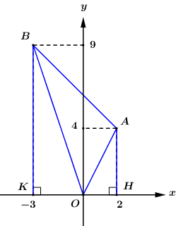 b) Gọi giao điểm là \(A,\,\,B\). Tính diện tích tam giác \(OAB\).