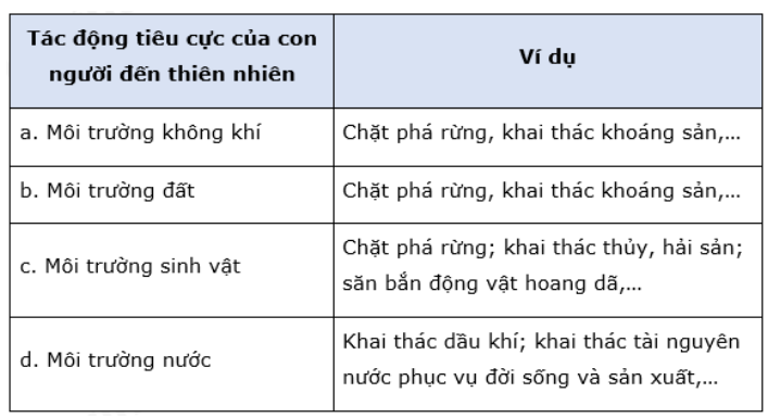 Dựa vào nội dung chương 4, 5, 6, 7 trong SGK, em hãy tìm các hoạt động khai thác tài nguyên gây tổn hại đến thiên nhiên và ô nhiễm môi trường theo gợi ý như sau: