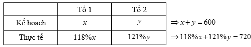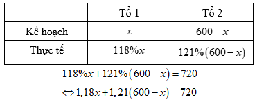 Theo kế hoạch hai tổ sản xuất 600 sản phẩm trong một thời gian nhất định. Do áp dụng kỹ thuật mới nên tổ 1 đã vượt mức 18% và tổ 2 vượt mức 21%. Vì vậy trong thời gian quy định họ đã làm được tất cả là 720 sản phẩm. Tính số sản phẩm được giao của mỗi tổ theo kế hoạch.