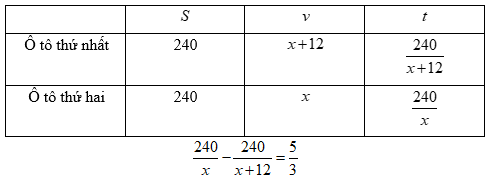 Hai ôtô khởi hành cùng một lúc đi từ A đến B dài 240km. Vì mỗi giờ ôtô thứ nhất đi nhanh hơn ôtô thứ hai 12km nên nó đến trước ô tô thứ hai 1 giờ 40 phút. Tính vận tốc của mỗi ôtô.