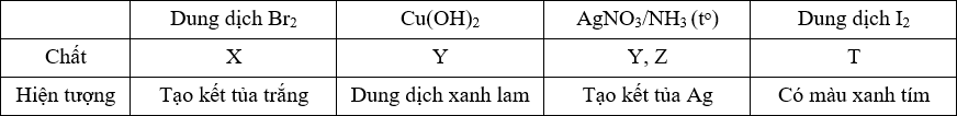 Kết quả thí nghiệm của các chất X, Y, Z, T với các thuốc thử được ghi ở bảng sau: Các