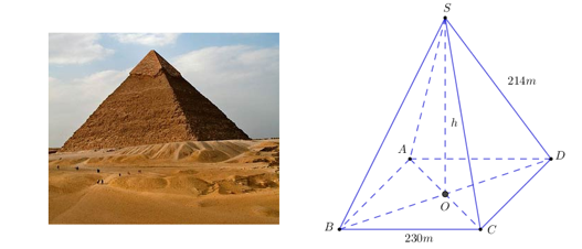 Kim tự tháp Kheops – Ai Cập có dạng hình chóp đều, đáy là hình vuông, các mặt bên là các tam giác cân chung đỉnh (hình vẽ). Mỗi cạnh bên của kim tự tháp dài 214 m, cạnh đáy của nó dài 230 m.