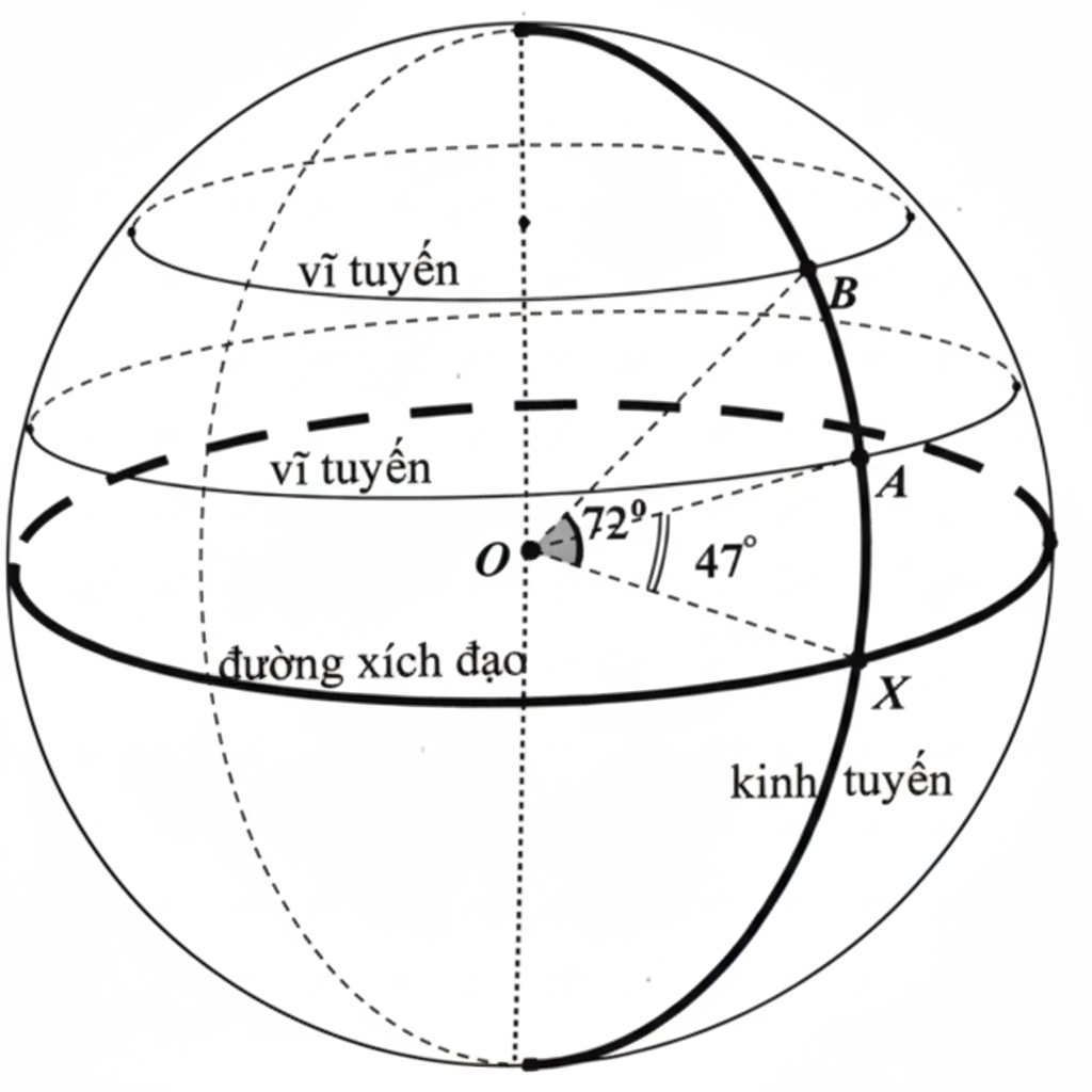 Cuối năm học, các bạn lớp 9A chia làm hai nhóm, mỗi nhóm chọn một khu vườn sinh thái ở Bắc bán cầu để tham quan. Khi mở hệ thống định vị GPS, họ phát hiện một sự trùng hợp khá thú vị là hai vị trí mà hai nhóm chọn đều nằm trên cùng một kinh tuyến và lần lượt ở các vĩ tuyến \({47^0}\) và \({72^0}\)