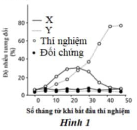 Một loài côn trùng H chuyên sống nhờ vào thức ăn là hạt của hai loài thực vật X và Y. Để nghiên cứu vai trò của các loài trong quần xã, một số mảnh rừng được dùng làm thí nghiệm, một số mảnh khác được dùng làm đối chứng. Trong một mảnh thí nghiệm, hạt của X và Y được bảo vệ khỏi bị côn trùng H ăn. Trong các mảnh đối chứng, hạt của X và Y không được bảo vệ. Đồ thị Hình 1 cho biết độ nhiều tương đối tính trung bình về cây non của các loài X và Y quan sát được trong các mảnh rừng nghiên cứu.
