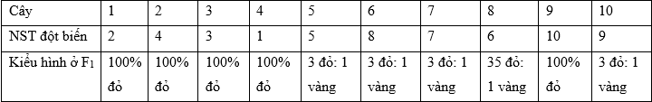 Ở một loài thực vật có bộ NST 2n = 20, gen A quy định hoa đỏ, alen a quy định hoa vàng. Trong quần thể xuất hiện đầy đủ 10 đột biến thể ba (2n + 1) khác nhau. Người ta đã thu thập 10 cây, mỗi cây bị đột biến thể ba ở một NST nhất định, không giống với dạng đột biến ở các cây khác và đều có kiểu hình hoa đỏ. Sau đó, cho mỗi cây tự thụ phấn, thu được kết quả như sau: