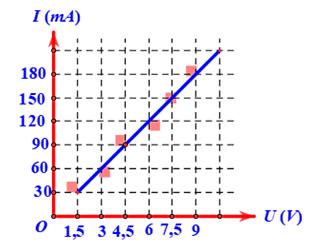 Một học sinh xác định điện trở R của một quang điện trở khi được chiếu sáng bằng cách mắc nối tiếp quang điện trở với ampe kế có điện trở nhỏ không đáng kể để đo cường độ dòng điện I chạy qua mạch rồi mắc với nguồn điện một chiều có suất điện động thay đổi được. Dùng vôn kế có điện trở rất lớn để đo hiệu điện thế U giữa hai đầu quang điện trở thu được đường đặc tuyến Vôn-Ampe của quang điện trở như hình vẽ. Biết công suất chiếu sáng là không đổi. Giá trị của R là