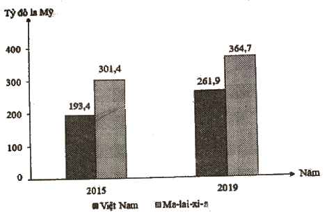 Cho biểu đồ:GDP CỦA VIỆT NAM, MA-LAI-XI-A NĂM 2015 VÀ 2019(Số liệu theo Niên giám thống kê Việt