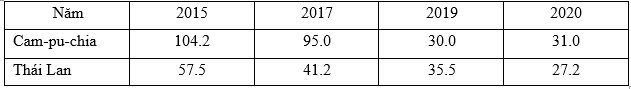 Cho bảng số liệu: SẢN LƯỢNG ĐẬU TƯƠNG CỦA CAM-PU-CHIA VÀ THÁI LAN, GIAI ĐOẠN 2015 - 2020 (Đơn