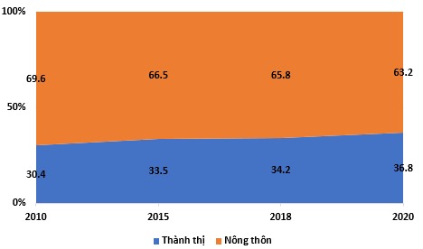 Biểu đồ thể hiện dân số thành thị và nông thôn nước ta, trong thời gian từ năm 2010 đến 2020 gồm 4 mốc thời gian, có đơn vị là %