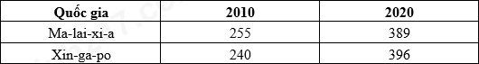 Cho bảng số liệu: GDP CỦA MA-LAI-XI-A VÀ XIN-GA-PO, NĂM 2010 VÀ 2020 (Đơn vị: Tỷ đô la