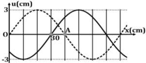 Một sóng hình sin lan truyền trên sợi dây dọc theo chiều dương trục Ox. Hình bên mô tả hình dạng của sợi dây tại thời điểm \({t_1}\) (đường nét liền) và \({t_2} = {t_1} + 0,3s\) (đường nét đứt). Tại thời điểm \({t_2}\), vận tốc của phần tử tại A có thể là