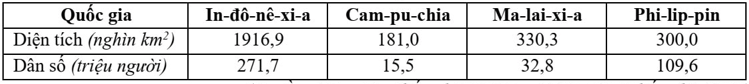 DIỆN TÍCH VÀ DÂN SỐ CỦA MỘT SỐ QUỐC GIA ĐÔNG NAM Á NĂM 2020