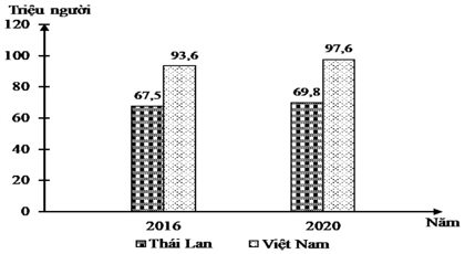 Theo biểu đồ, nhận xét nào sau đây đúng về sự thay đổi số dân năm 2020 so với năm 2016 của Thái Lan và Việt Nam?