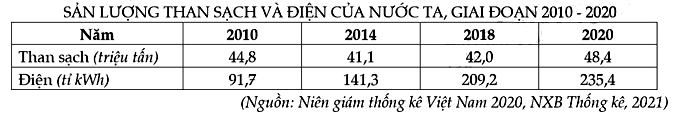 Theo bảng số liệu, để thể hiện sản lượng than sạch và điện của nước ta giai đoạn 2010 - 2020,