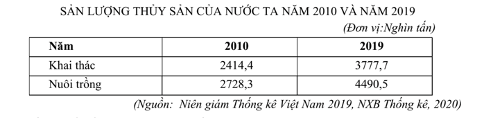Cho bảng số liệu:SẢN LƯỢNG THỦY SẢN CỦA NƯỚC TA NĂM 2010 VÀ NĂM 2019(Đơn vị: Nghìn