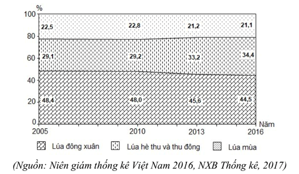 Cho biểu đồ về sản lượng lúa phân theo mùa của nước ta giai đoạn 2005 - 2016:(Nguồn: Niên