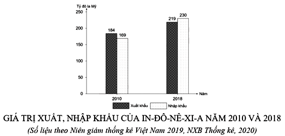 Theo biểu đồ, nhận xét nào sau đây đúng về sự thay đổi giá trị xuất, nhập khẩu năm 2018 so với năm 2010 của In-đô-nê-xi-a?