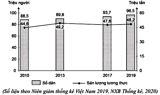 Cho biểu đồ về số dân và sản lượng lương thực nước ta giai đoạn 2010 - 2019: