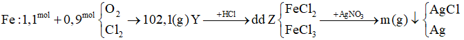 Đốt cháy 61,6 gam Fe trong 20,16 lít hỗn hợp khí X gồm clo và oxi, sau phản ứng thu được 102,1 gam