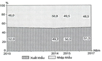 Cho biểu đồ sau:CƠ CẤU XUẤT NHẬP KHẨU HÀNG HÓA CỦA IN-ĐÔ-NÊ-XI-A, GIAI ĐOẠN 2010 - 2017(Số