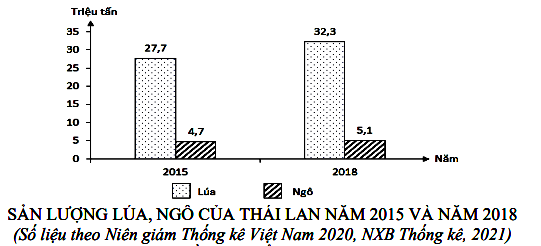 Cho biểu đồ:Theo biểu đồ, nhận xét nào sau đây đúng về sự thay đổi sản lượng lúa, ngô