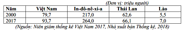 Cho bảng số liệu: DÂN SỐ CỦA MỘT SỐ QUỐC GIA NĂM 2000 VÀ 2017