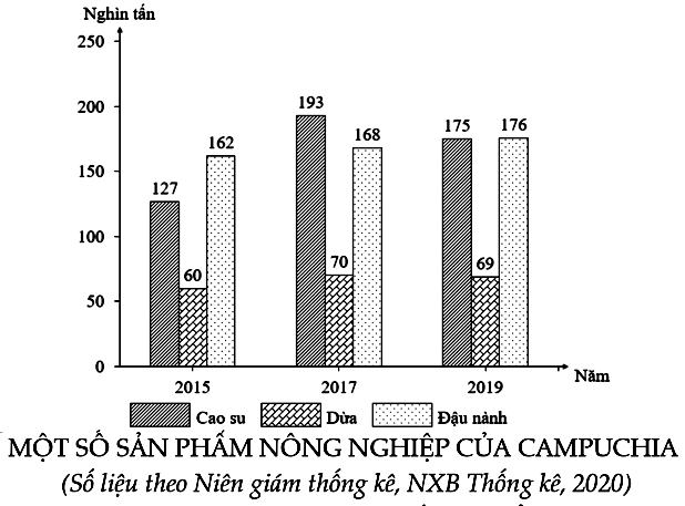 Theo biểu đồ, nhận xét nào sau đây đúng với một số sản phẩm nông nghiệp của Cam-pu-chia giai đoạn 2015 - 2019?