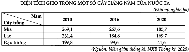 Theo bảng số liệu, biểu đồ nào thích hợp nhất thể hiện diện tích gieo trồng một số cây hằng năm của nước ta giai đoạn 2010 – 2020?